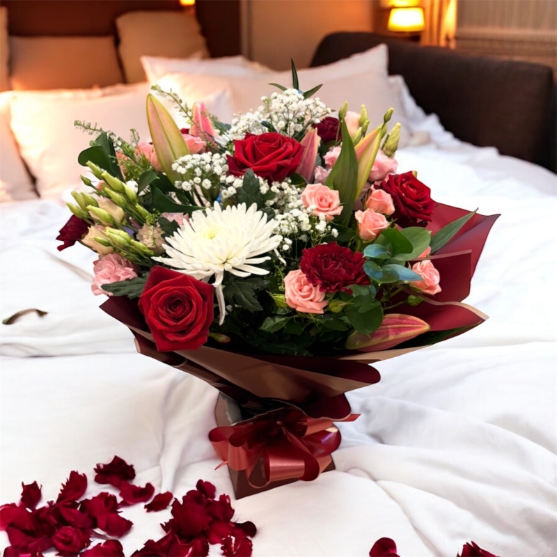 Our Florists choice Valentines Day Handtie. Made in deep reds and pinks with flowers chosen fresh on the day.