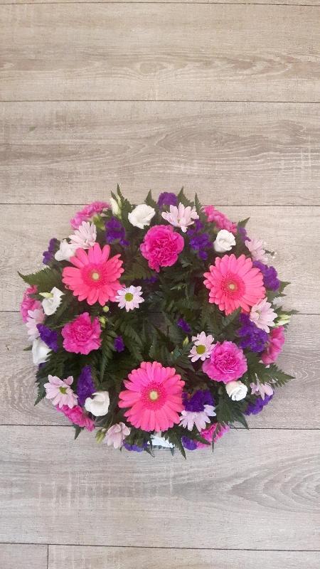 Florists choice of blooms in feminine shades of pinks and purples