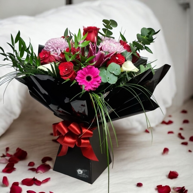 contains at least six luxury red roses and florists choice of blooms on the day.