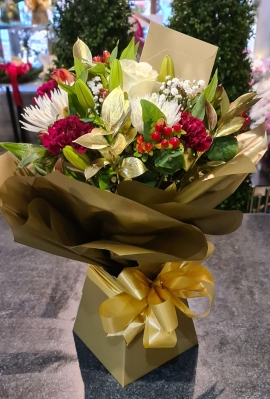A beautiful festive box of reds and golds with fresh Christmas berries and foliage.