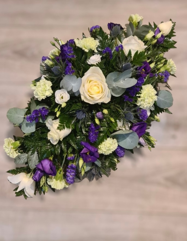 A Scottish themed double ended spray. Made with a selection of fresh foliage complemented with purple, lilac, cream and green tones.